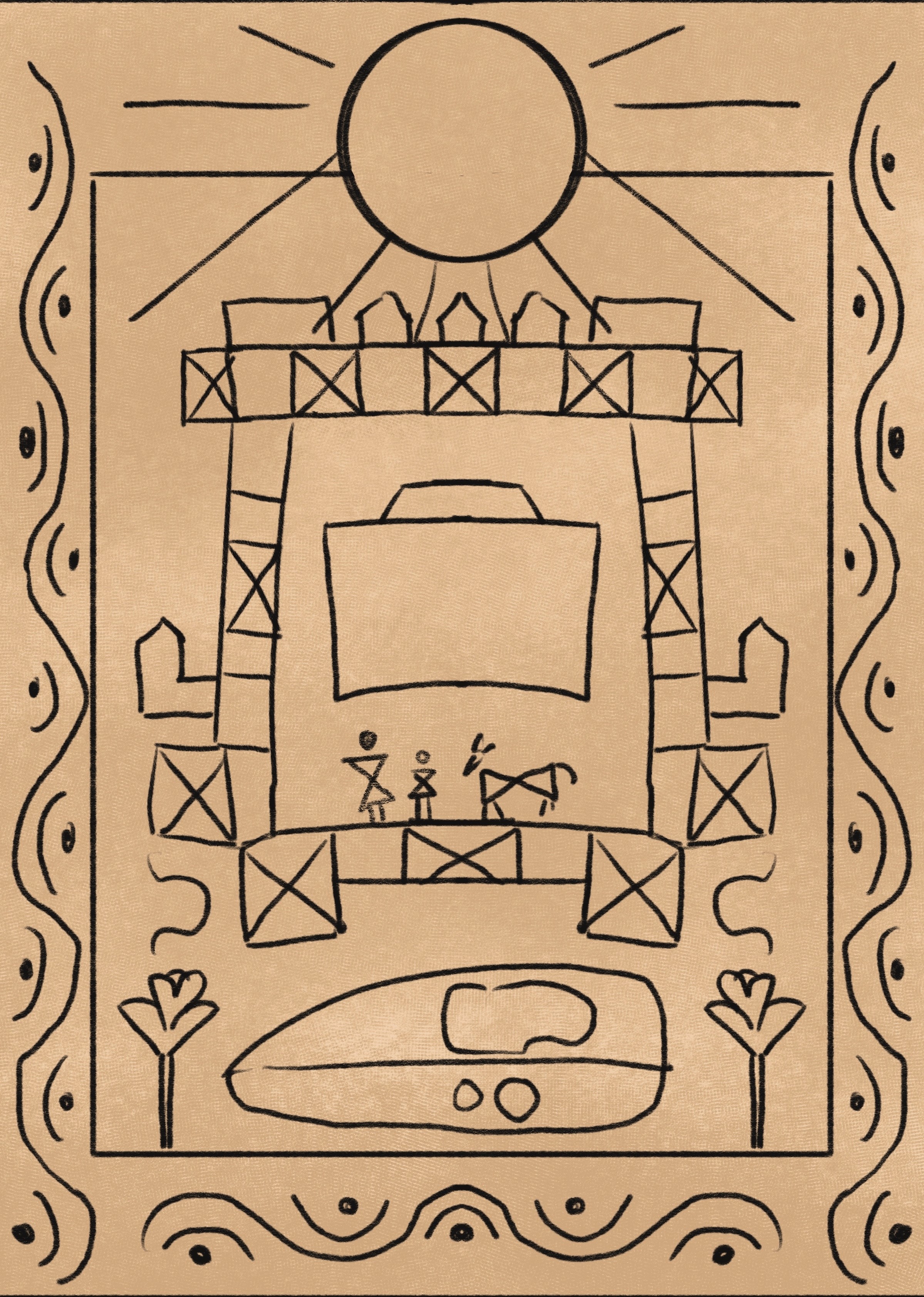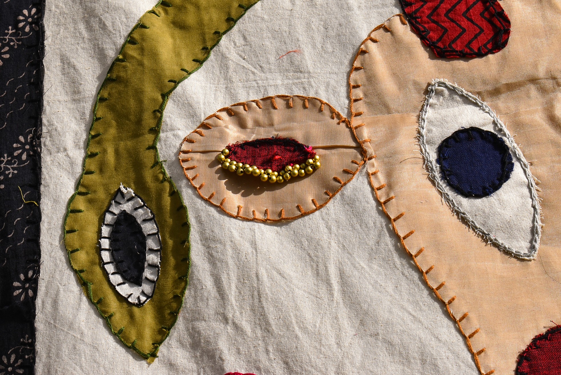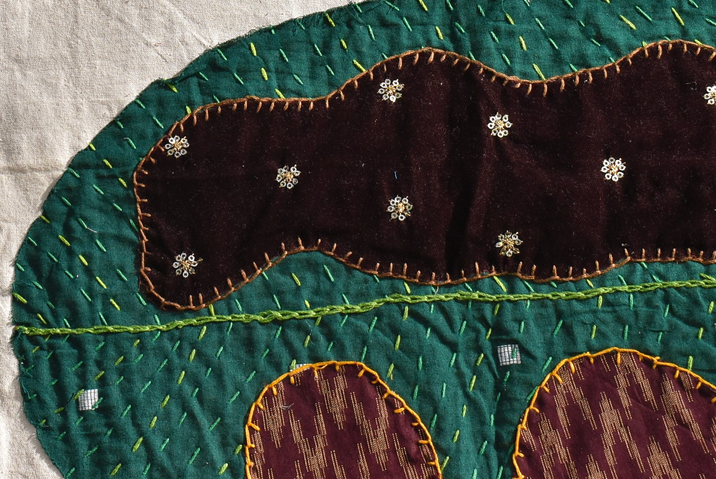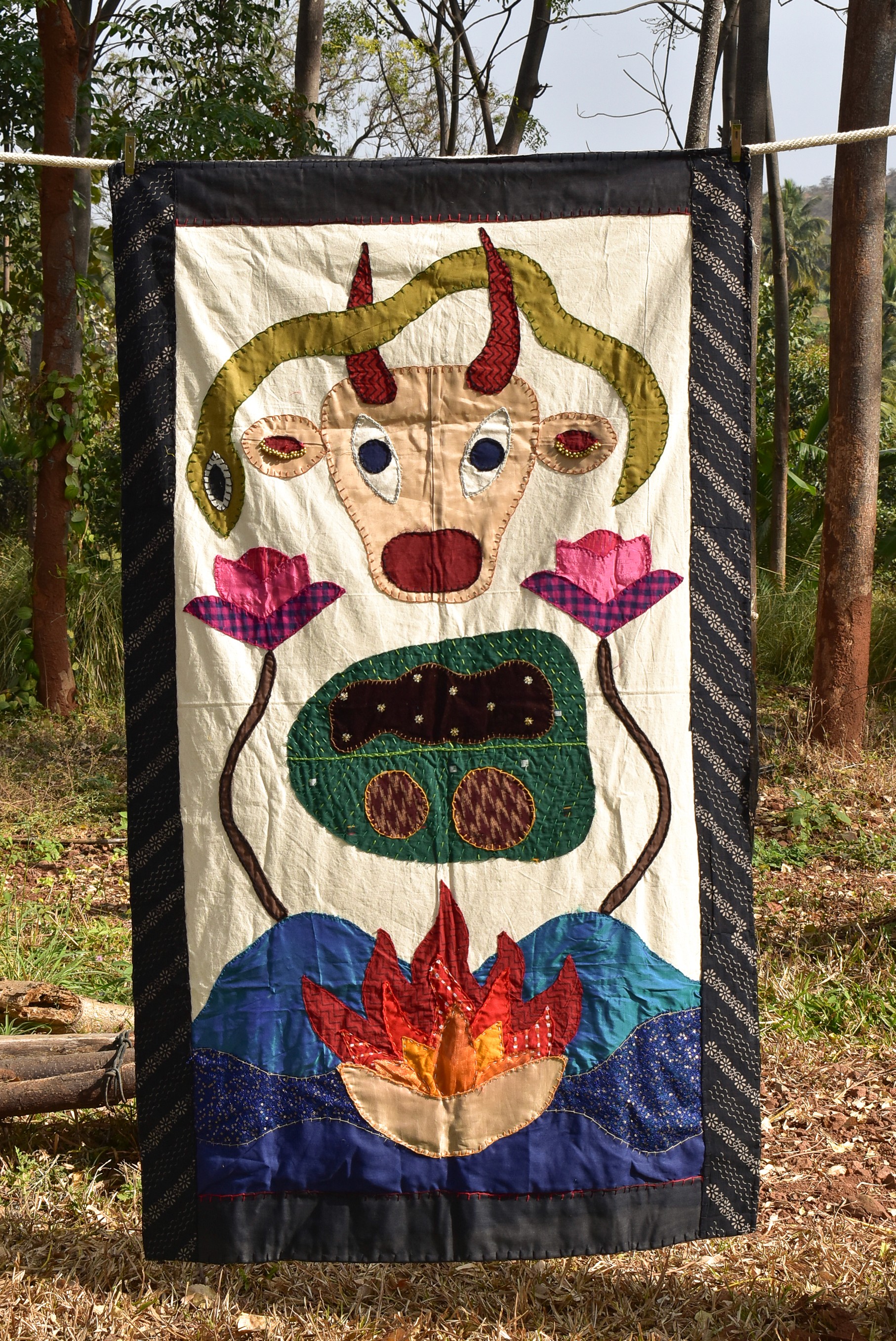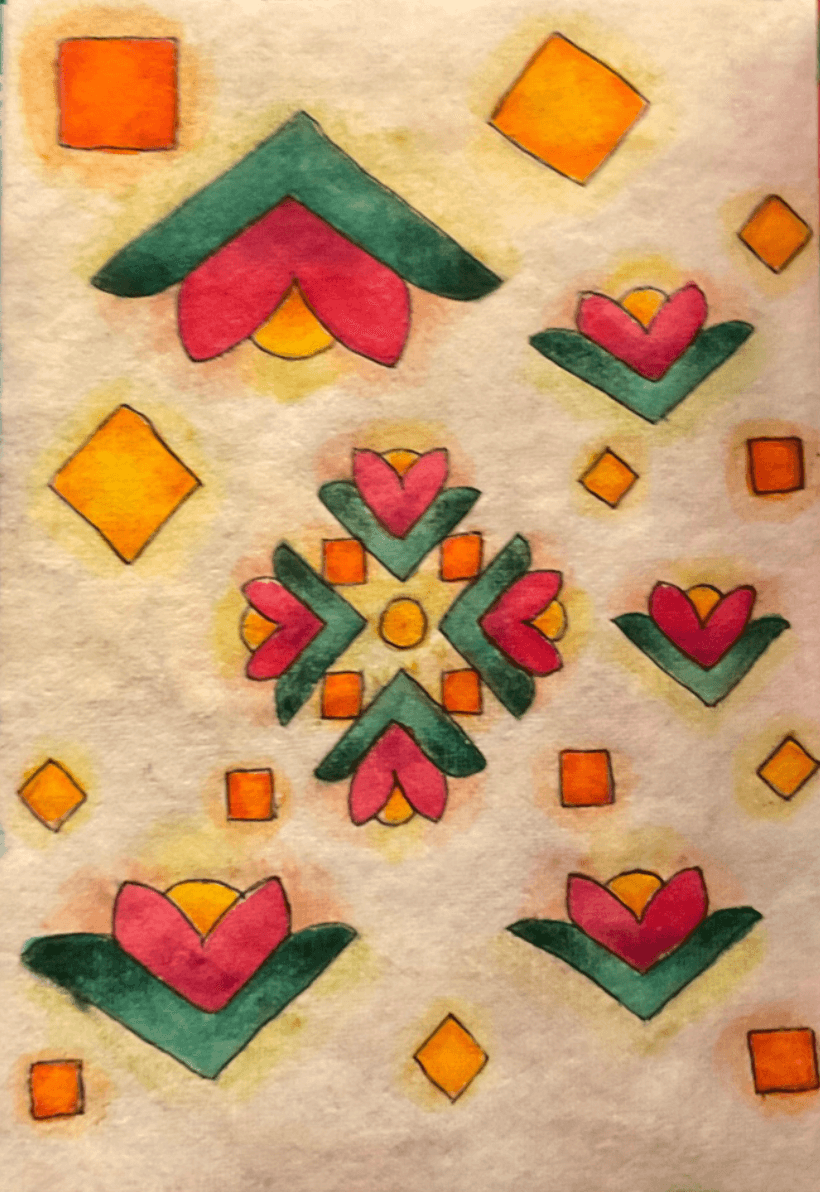 The flower motif on either side of the tapestry is a part of a rangoli pattern that my mom taught in my middle school for a rangoli making competition. I sadly did not win the competition, but the pattern I now hold very dear to my heart.